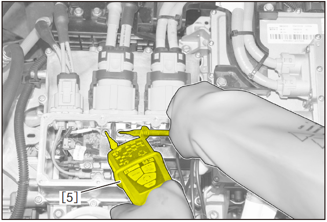 - 使用 VAT 测试仪分别测量端子与壳体端之间电压,如果电压为 0V,说明高压系统放电完毕,无高压电;如果电压不为0V,不可进行维修作业,否则可能会发生高压触电危险 ,等待电压为0V 后,再进行维修作业。