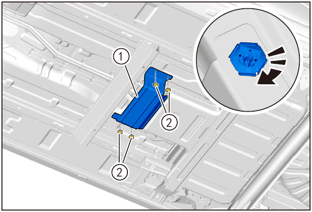 - 将动力电池防护板①安装孔对准固定螺柱,使用一字起辅助沿箭头方向旋转,安装固定卡夹②。