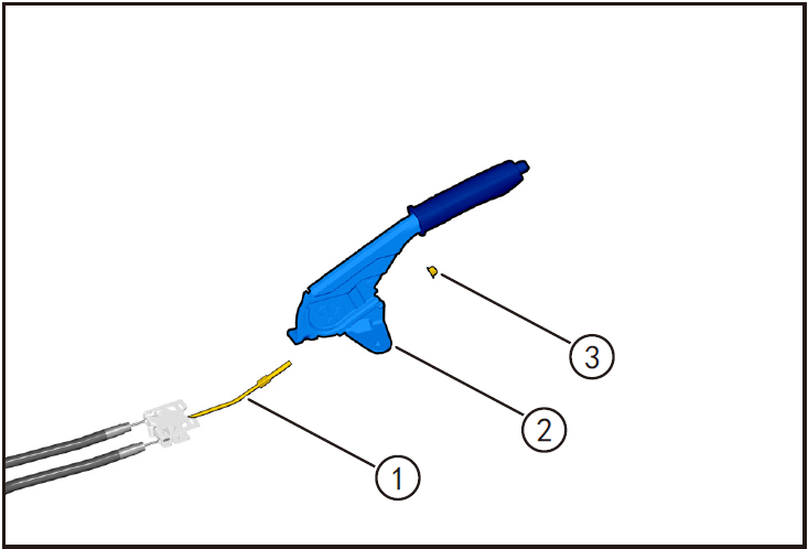 - 按住制动蹄片定位销后端(A),同时使用尖嘴钳夹住制动蹄片定位销压簧垫圈①,旋转,直至定位销压簧垫圈中心开口处与定位销前端重合,取下定位销压簧垫圈①、定位销压簧②A 和定位销③。