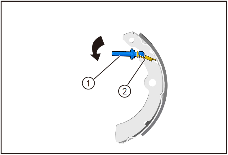 - 按住调整螺栓限位卡①,将调整螺栓②沿箭头方向旋转至最底端,使制动蹄片(分泵端)两边间距最小。