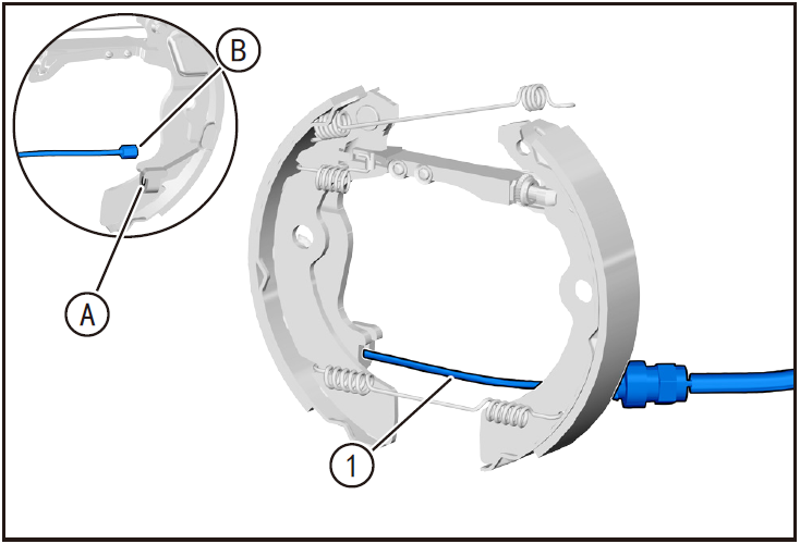 - 将组合完成后的驻车制动蹄片移至安装位置,将驻车制动拉索①锁头(A)卡入驻车制动拉臂凹槽(B)。