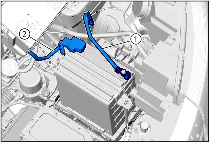 - 脱开蓄电池负极电缆①、正极电缆②。